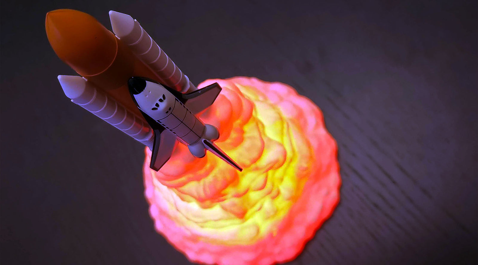 Blast off into space with this fiery scene of a rocket taking off, modeled after images of actual space shuttles being shot off into space. Created with 3D printing technology, this is ideal as a table lamp or night light in your children's room.